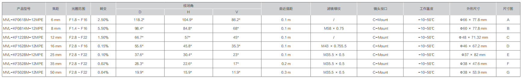首頁 / 産品中心 / 工業鏡頭 / KF-E系列(1.1"12MP )