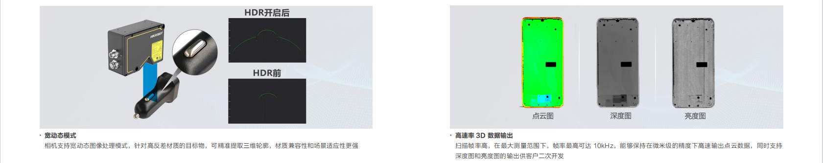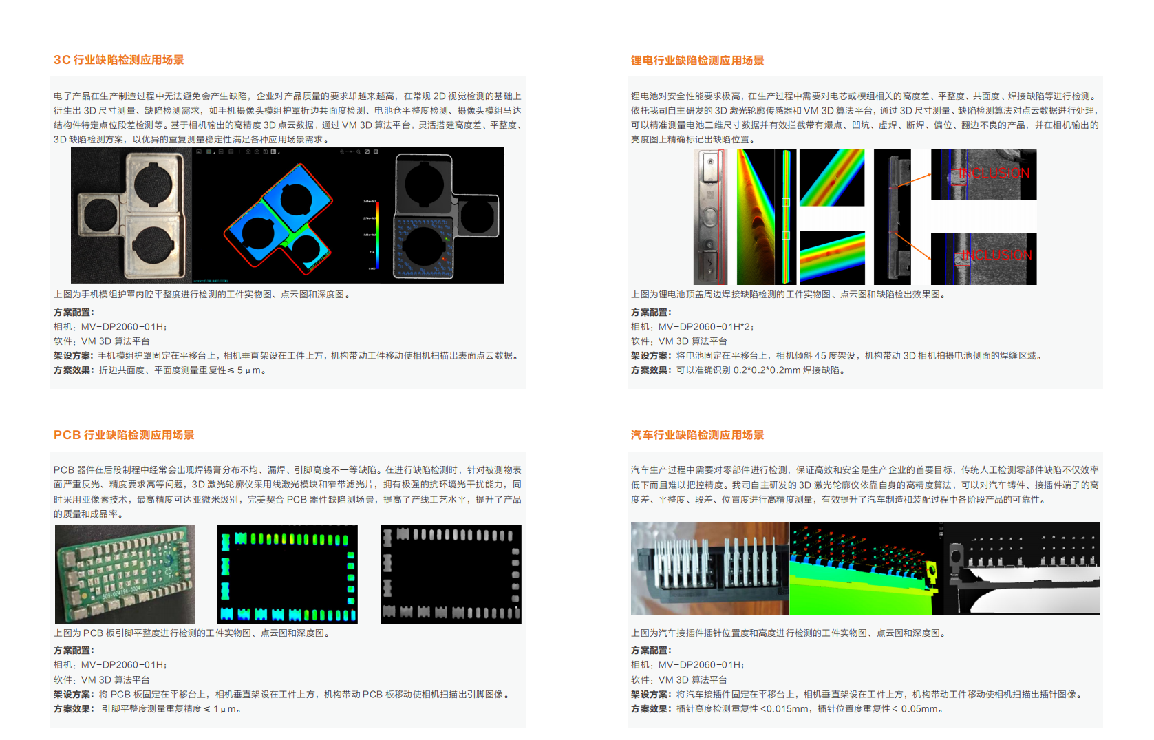 基于激光三角測量原理(lǐ),通(tōng)過硬件內(nèi)置的高(gāo)精度 3D 算(suàn)法,實時(shí)輸出高(gāo)幀率、微米級精度的點雲數(shù)據、深度圖和(hé)亮度圖數(shù)據。廣泛适用于 3C、锂電(diàn)、PCB 等行(xíng)業中的在線、非接觸式、高(gāo)精度 3D 測量應用場(chǎng)景。