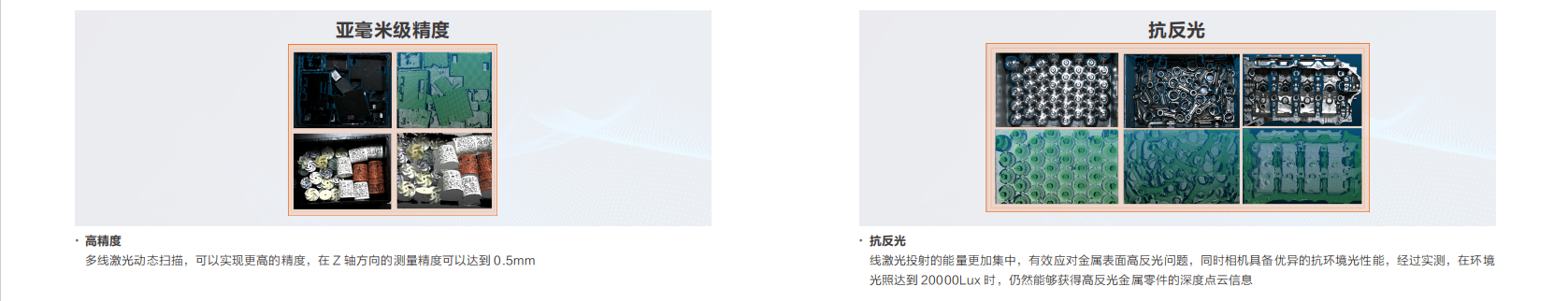 海康機器(qì)人(rén)在 3D 成像及圖像處理(lǐ)領域深耕多(duō)年,自研激光振鏡 3D 相機,采用基于激光振鏡的動态線激光方案,實現更高(gāo)的精度,有(yǒu)效解決工件由于吸光、高(gāo)反以及環境光幹擾等諸多(duō)不利因素的影(yǐng)響,确保工件 3D 成像的準确穩定可(kě)靠。