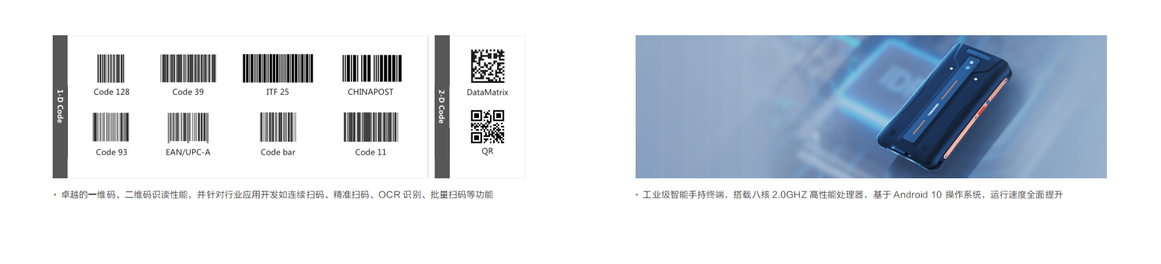 一款智能安卓系統的 PDA 設備,采用自研影(yǐng)像類讀碼模組與自研條碼算(suàn)法,可(kě)高(gāo)效讀取主流一維碼和(hé)二維碼,可(kě)滿足 智能制(zhì)造、 物流、零售、倉儲、資産管理(lǐ)等多(duō)行(xíng)業應用。